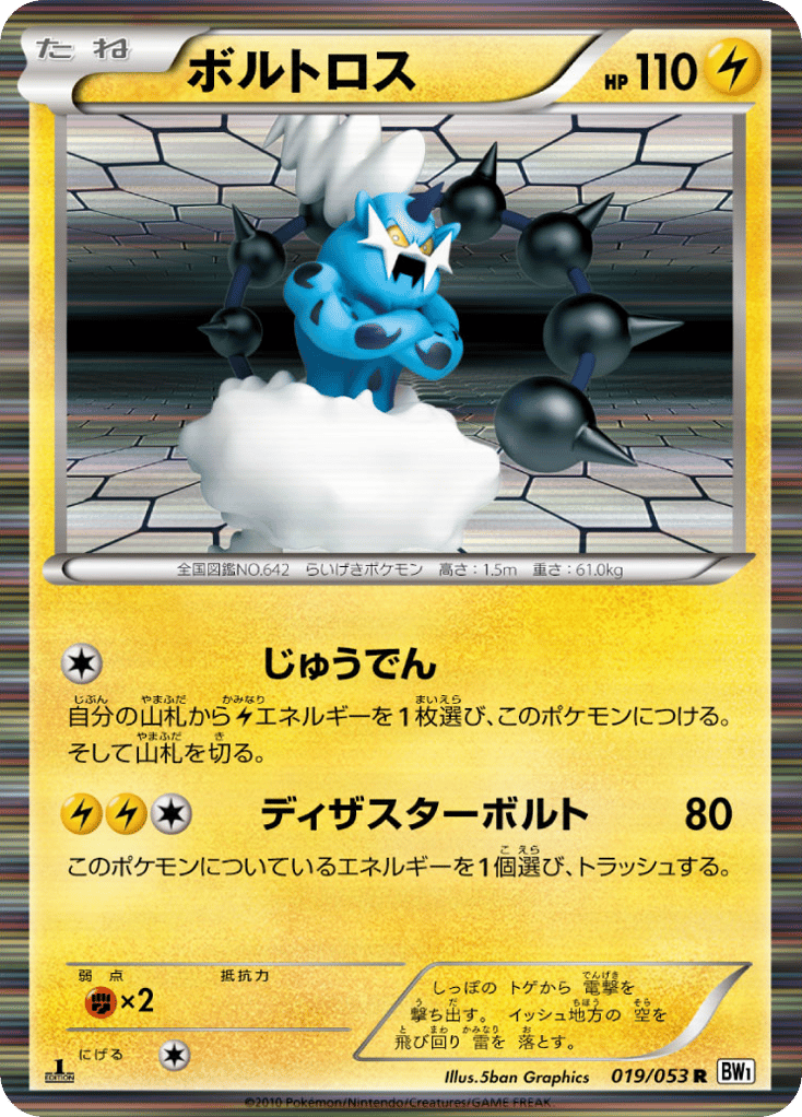 しっぽの トゲから 電撃を 撃ち出す。 イッシュ地方の 空を 飛び回り 雷を 落とす。