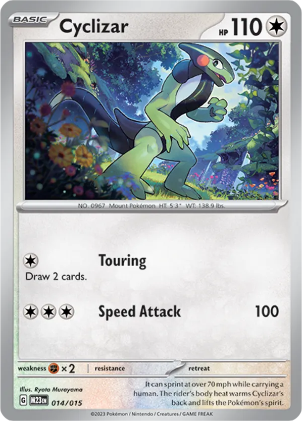 It can sprint at over 70 mph while carrying a human. The rider's body heat warms Cyclizar's back and lifts the Pokémon's spirit.