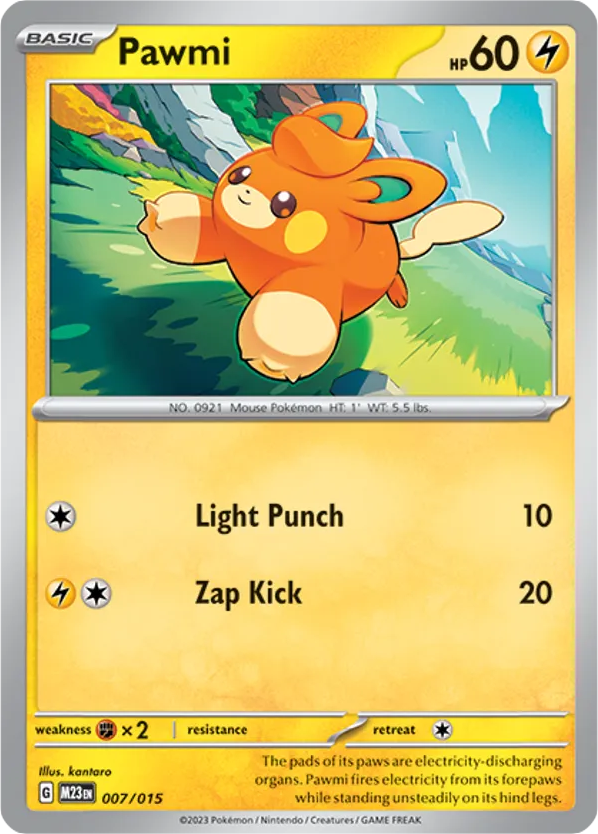 The pads of its paws are electricity-discharging organs. Pawmi fires electricity from its forepaws while standing unsteadily on its hind legs.