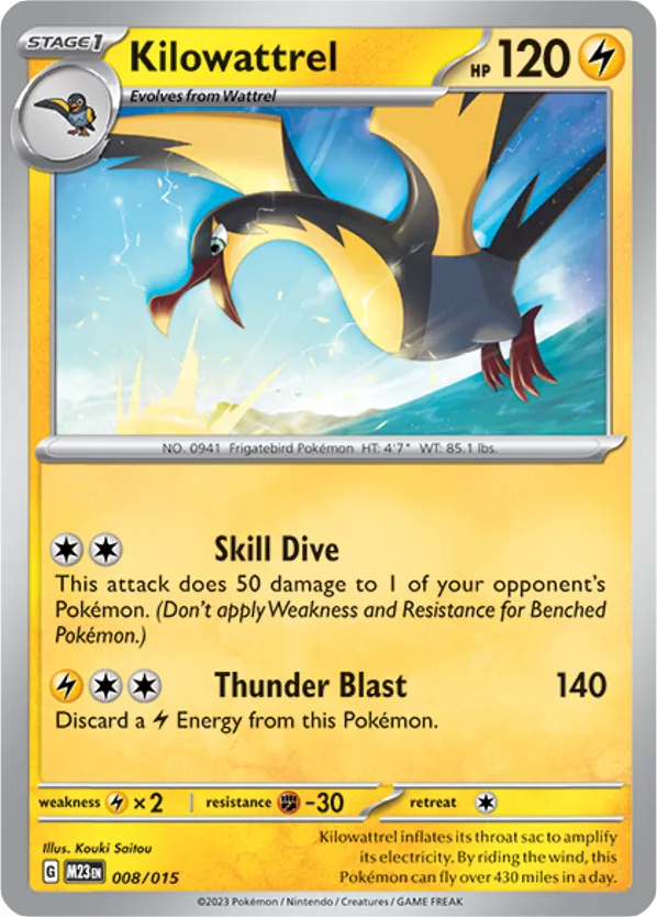 Kilowattrel inflates its throat sac to amplify its electricity. By riding the wind, this Pokémon can fly over 430 miles in a day.