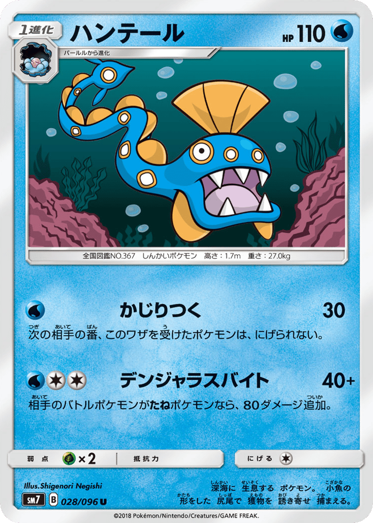 深海に 生息する ポケモン。 小魚の 形をした 尻尾で 獲物を 誘き寄せ 捕まえる。