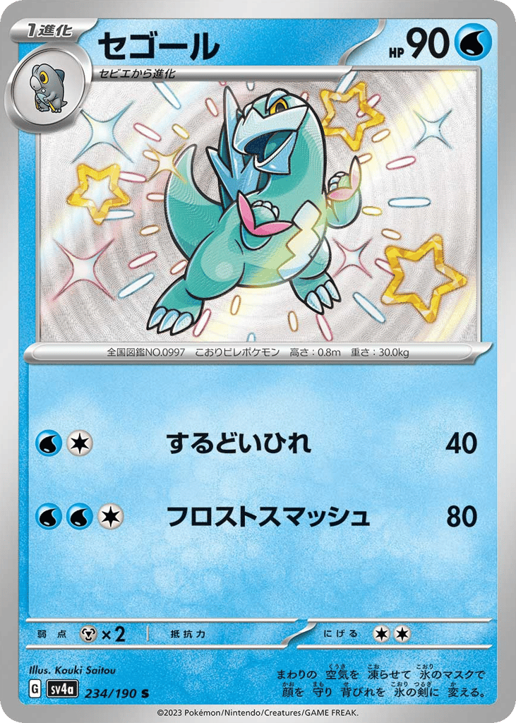まわりの 空気を 凍らせて 氷のマスクで 顔を 守り 背びれを 氷の剣に 変える。