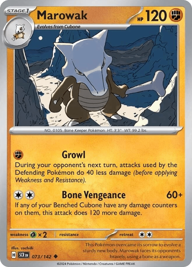 This Pokémon overcame its sorrow to evolve a sturdy new body. Marowak faces its opponents bravely, using a bone as a weapon.