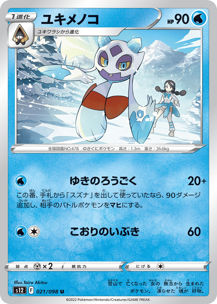 雪山で 亡くなった 女の 無念から 生まれた ポケモン。 凍らせた 魂が 好物。