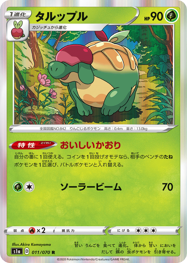 甘い りんごを 食べて 進化。 体から 甘い においを だして 餌の 虫ポケモンを 引き寄せる。