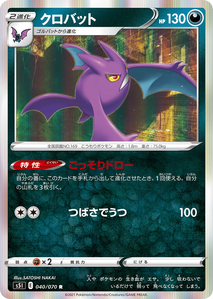 人や ポケモンの 生き血が エサ。 少し 吸わないで いるだけで 弱って 飛べなくなって しまう。