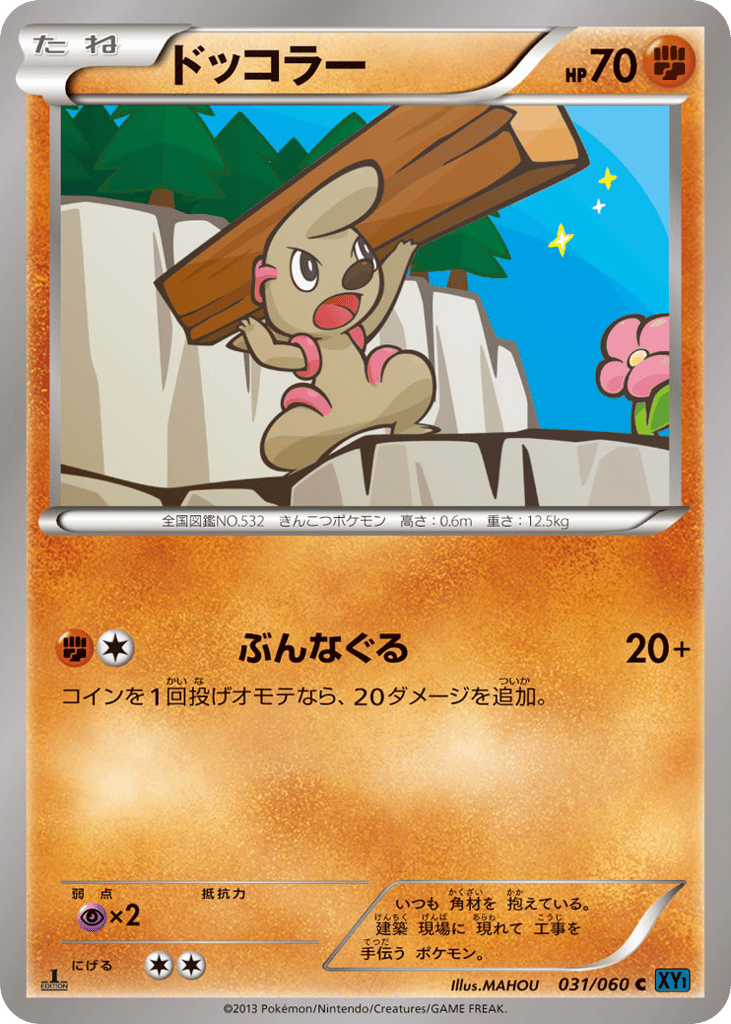 いつも 角材を 抱えている。 建築 現場に 現れて 工事を 手伝う ポケモン。
