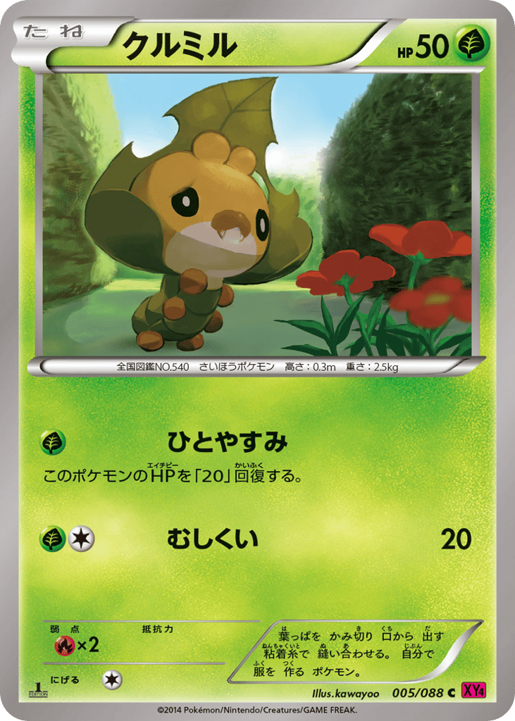 葉っぱを かみ切り 口から 出す 粘着糸で 縫い合わせる。 自分で 服を 作る ポケモン。